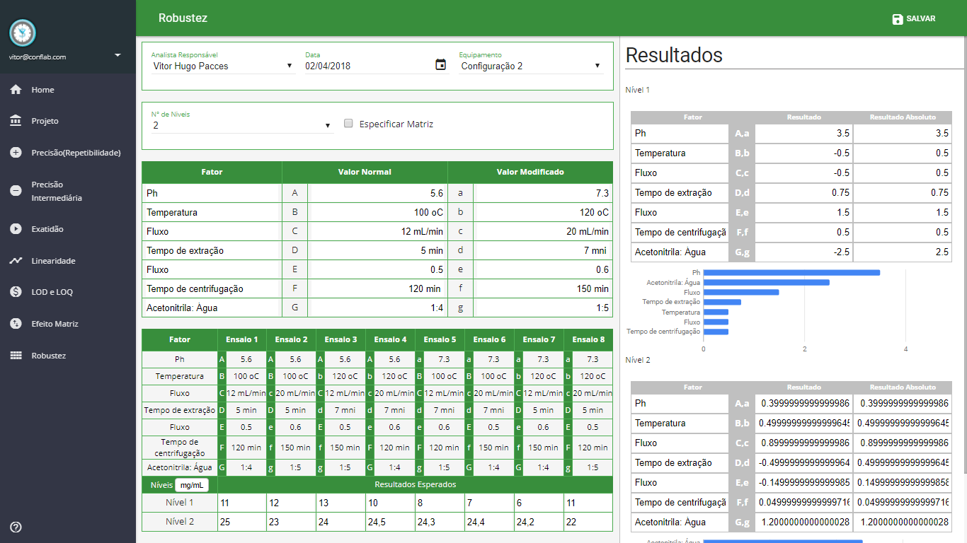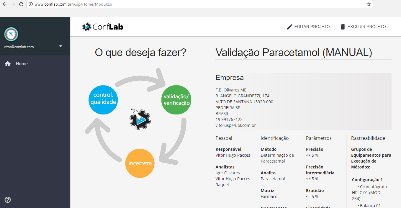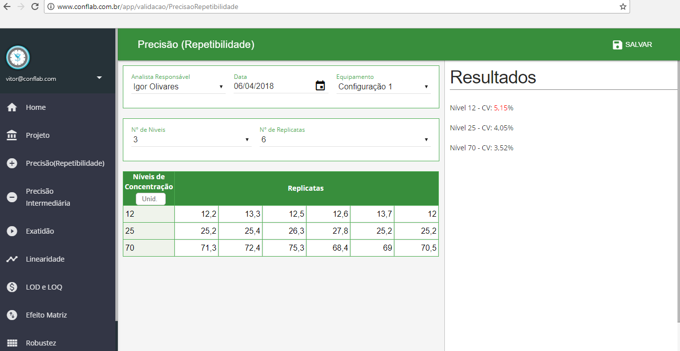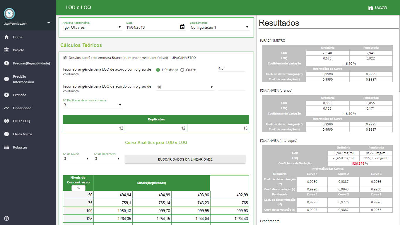 O software ConfLab Validação realiza inúmeros cálculos, em diferentes parâmetros, focando no atendimento de guias ou normas para validação de métodos e foi desenvolvido com foco na nova ISO 17025:2017. A ideia é que o usuário somente entre com os valores experimentais e o software, automaticamente, calcula os parâmetros, apresenta os resultados e permite a impressão de um relatório de validação totalmente personalizável, com todos os dados de rastreabilidade exigidos pelos sistemas de gestão da qualidade. É também compatível e atende as exigências das Boas Práticas de Laboratório (BPL). Dentre os parâmetros para a Validação de Métodos destacam-se: